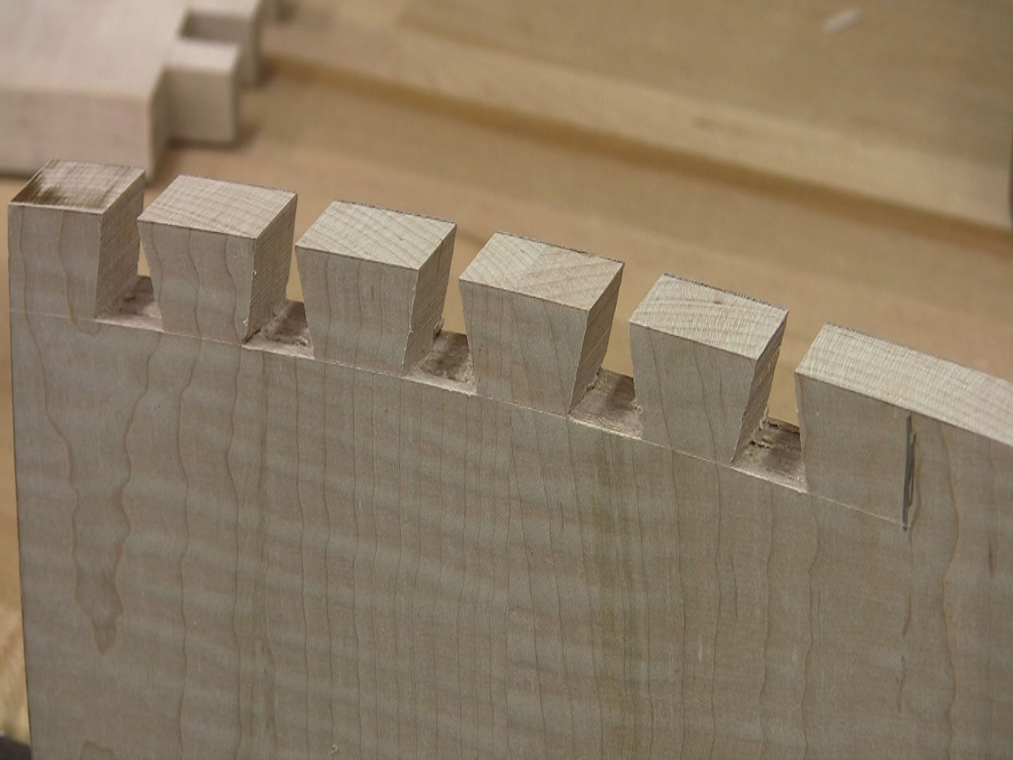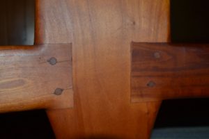 The opening photo in this post is a close-up of the apron to leg joint on a triangular-based table. I’ll concede there are seldom great methods for joining triangle-based tables. Merely beveling the end of the apron, screwing it to the leg, plugging the hole and puttying the gaps, probably isn’t one of the better solutions. A spline near the back of the apron, mortised into the leg would have provided, at least, a little side-grain to side-grain gluing surface.
