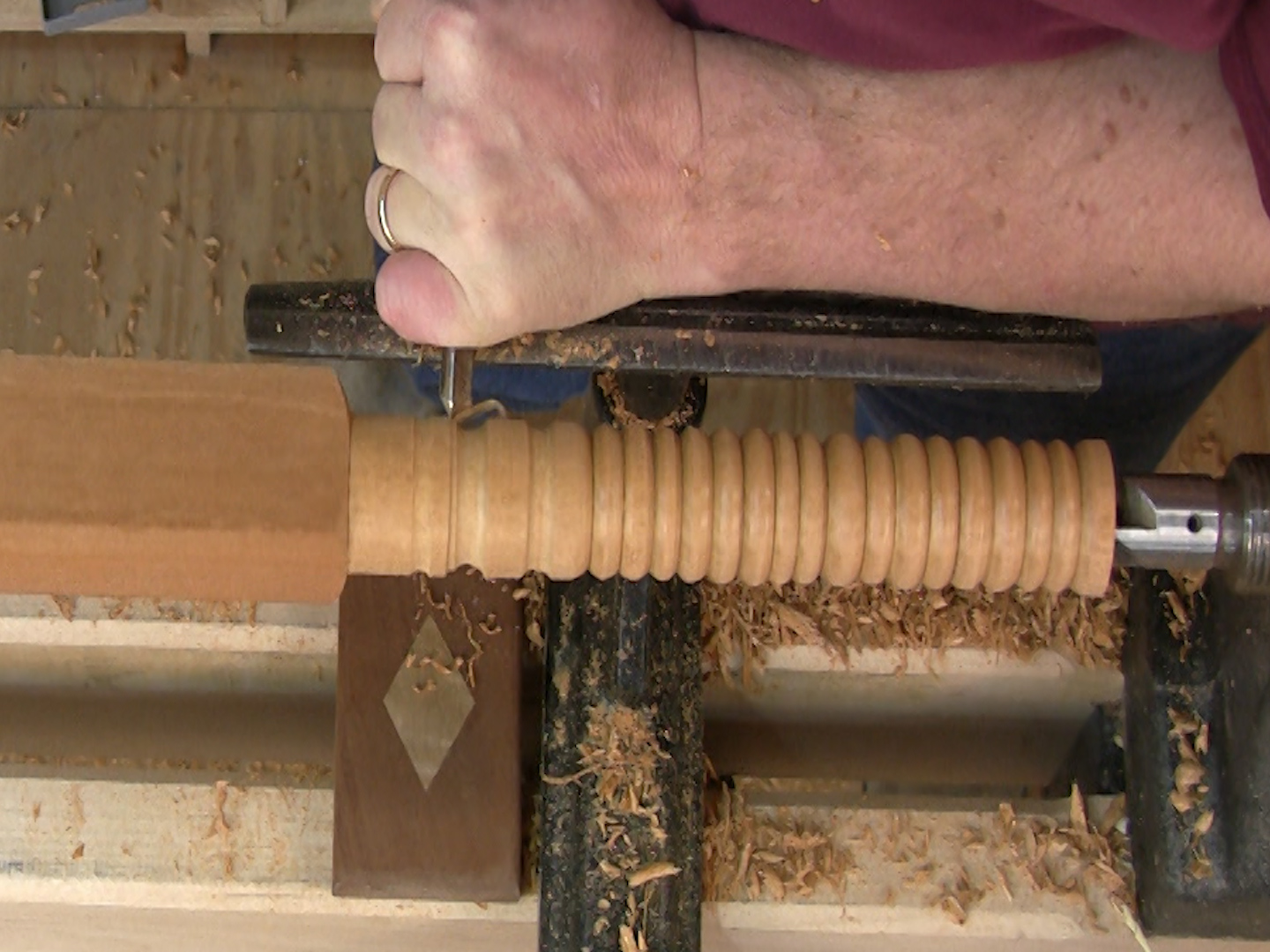 When cutting with a gouge, long curls is the desired result.Getting the gouge to cut is nearly the same as getting the skew to cut. You’ve got to work the tool up on edge, so the cut is sheer. The minute you lay the tool down flat, you start to scrape, and that’s not a good thing.