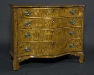 There’s a simple elegance to this Massachusetts Serpentine Chest, yet there’s plenty of drama. From its fluted, chamfered corners and uplifting bracket feet to its undulating drawer fronts this chest has got it all going on.