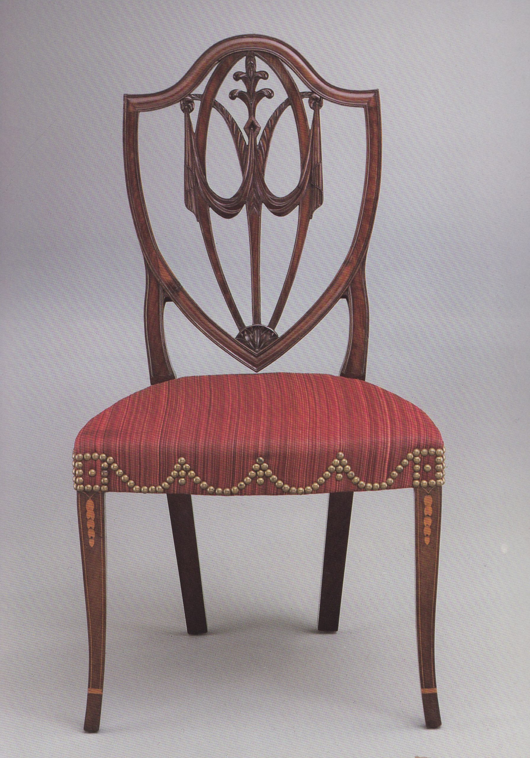 A natural progression in design from the late Chippendale chairs, the Shieldback is constructed more like a Queen Anne Baloon seat than a typical trapezoidal seat Chippendale chair. The pierced and carved back splat with its drop and swag motif is utterly Neoclassical in design. Add is French flared legs and a bit of inlay, and you’ve got all the elements of the Federal period in one piece.